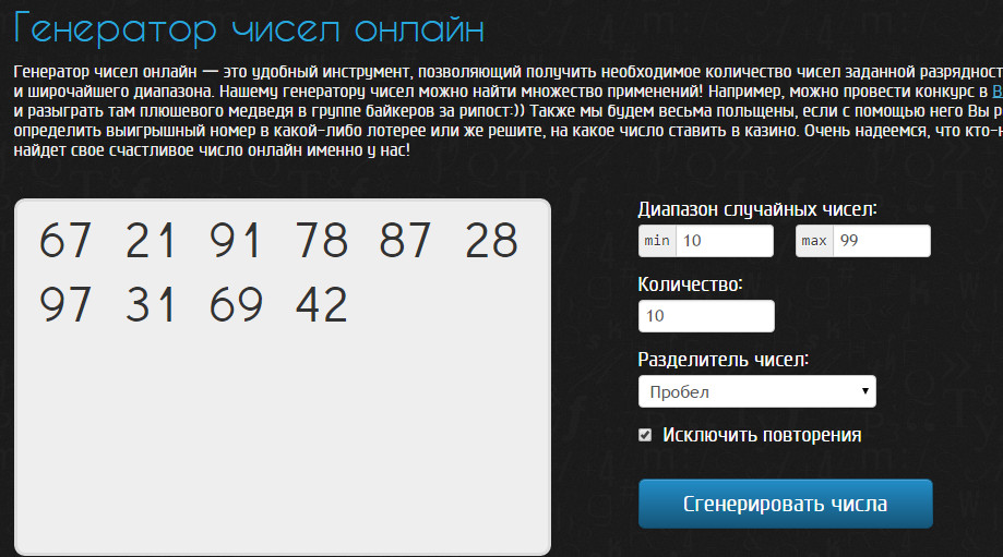 Каждую неделю или раз в две недели (зависит от активности пользователей) я буду генерировать 9 двузначных чисел и выкладывать на сайте скриншот с этими числами.
