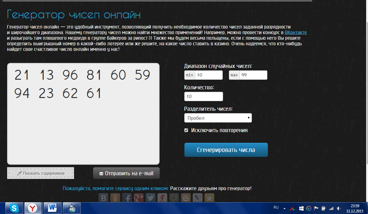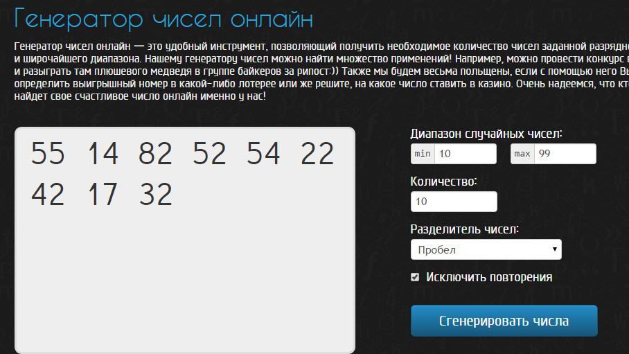 Каждую неделю или раз в две недели (зависит от активности пользователей) я буду генерировать 9 двузначных чисел и выкладывать на сайте скриншот с этими числами.